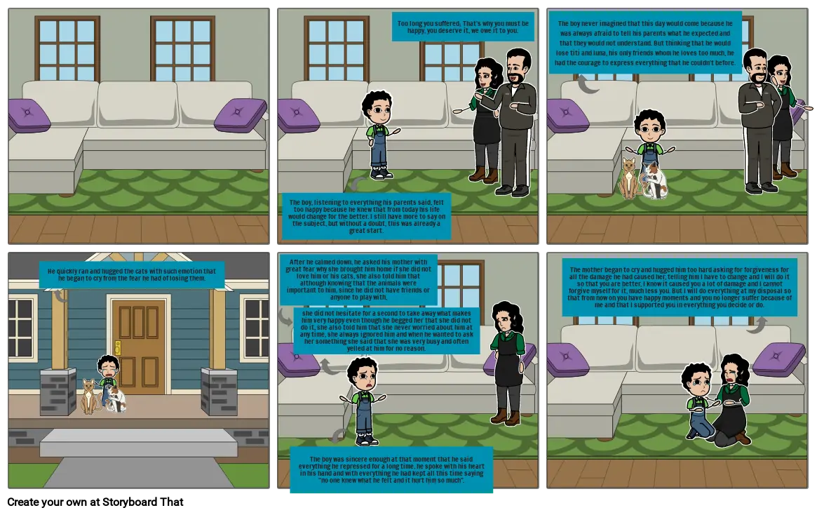 After he calmed down, he asked his mother with great fear why she brought him home if she did not love him or his cats, she also told him that although knowing that the animals were important to him, since he did not have friends or anyone to play with,