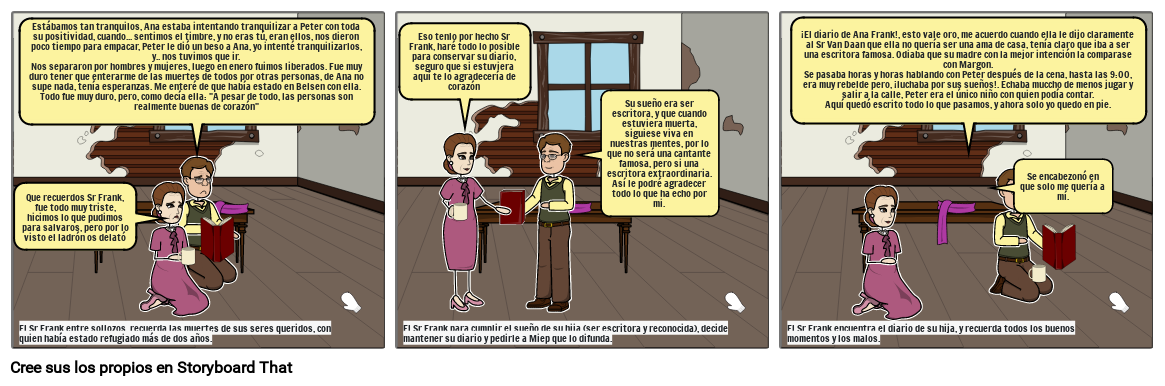 El Sr Frank para cumplir el sueño de su hija (ser escritora y reconocida), decide mantener su diario y pedirle a Miep que lo difunda.