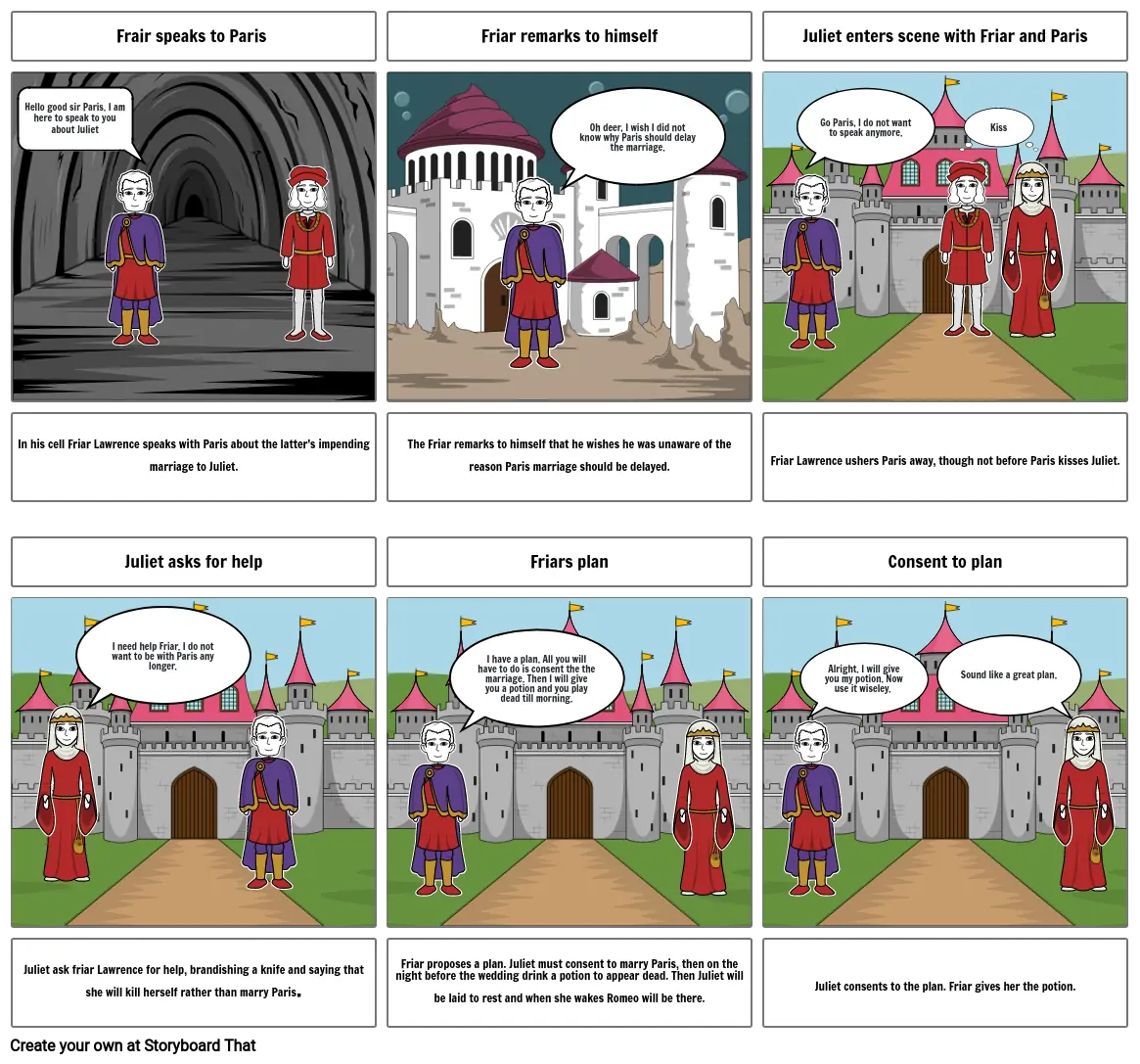Friar proposes a plan. Juliet must consent to marry Paris, then on the night before the wedding drink a potion to appear dead. Then Juliet will be laid to rest and when she wakes Romeo will be there.