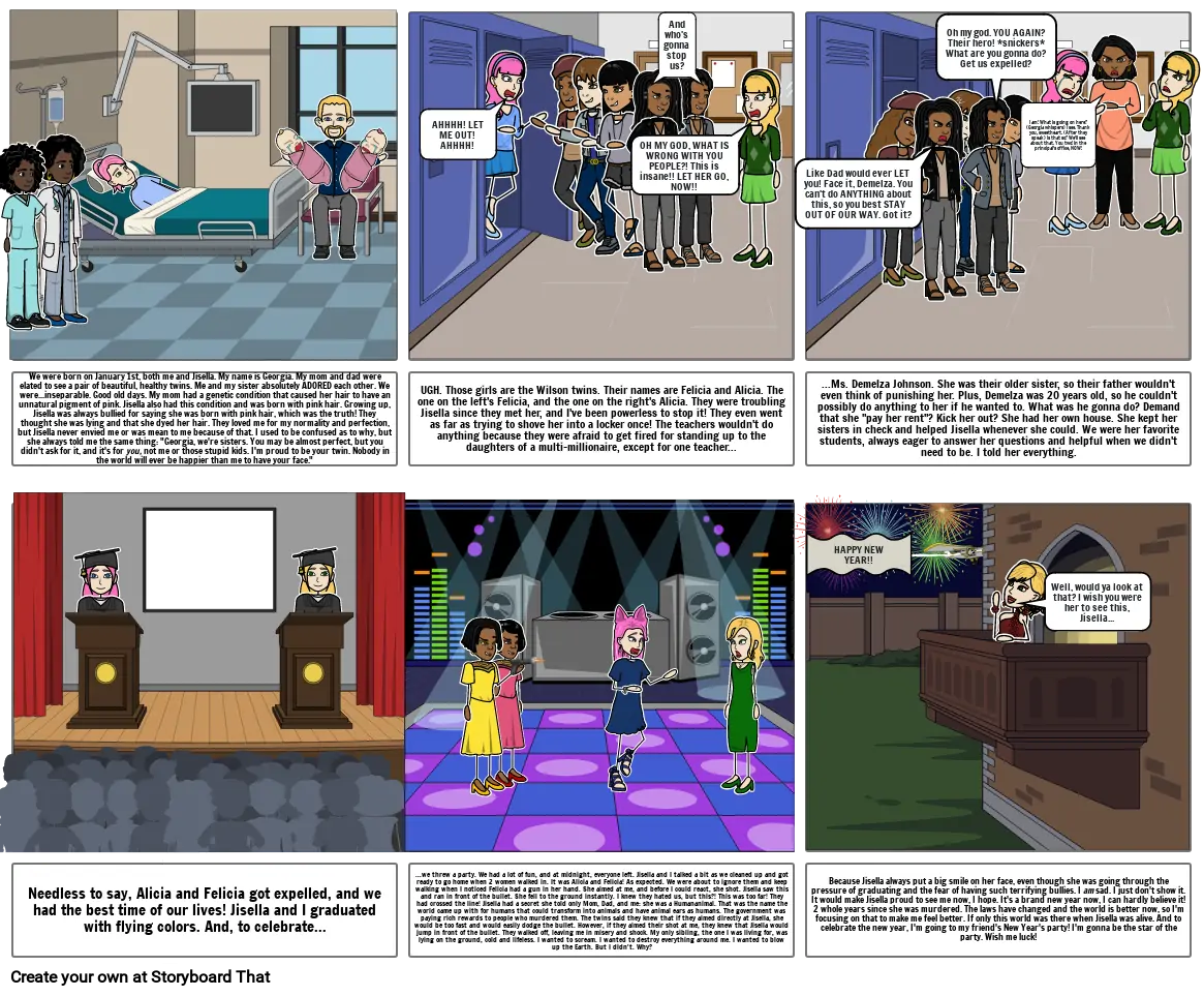 We were born on January 1st, both me and Jisella. My name is Georgia. My mom and dad were elated to see a pair of beautiful, healthy twins. Me and my sister absolutely ADORED each other. We were...inseparable. Good old days. My mom had a genetic condition that caused her hair to have an unnatural pigment of pink. Jisella also had this condition and was born with pink hair. Growing up, Jisella was always bullied for saying she was born with pink hair, which was the truth! They thought she was lying and that she dyed her hair. They loved me for my normality and perfection, but Jisella never envied me or was mean to me because of that. I used to be confused as to why, but she always told me the same thing: "Georgia, we're sisters. You may be almost perfect, but you didn't ask for it, and it's for you, not me or those stupid kids. I'm proud to be your twin. Nobody in the world will ever be happier than me to have your face."