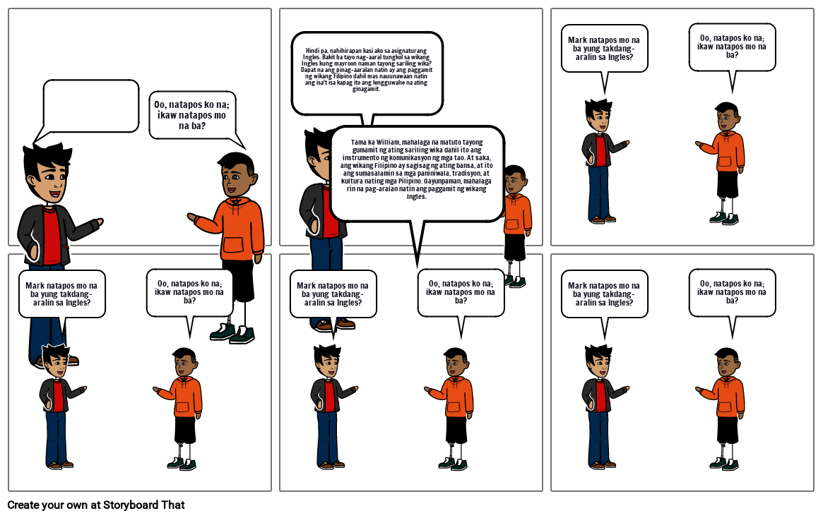 Hindi pa, nahihirapan kasi ako sa asignaturang Ingles. Bakit ba tayo nag-aaral tungkol sa wikang Ingles kung mayroon naman tayong sariling wika? Dapat na ang pinag-aaralan natin ay ang paggamit ng wikang Filipino dahil mas nauunawaan natin ang isa't isa kapag ito ang lengguwahe na ating ginagamit.