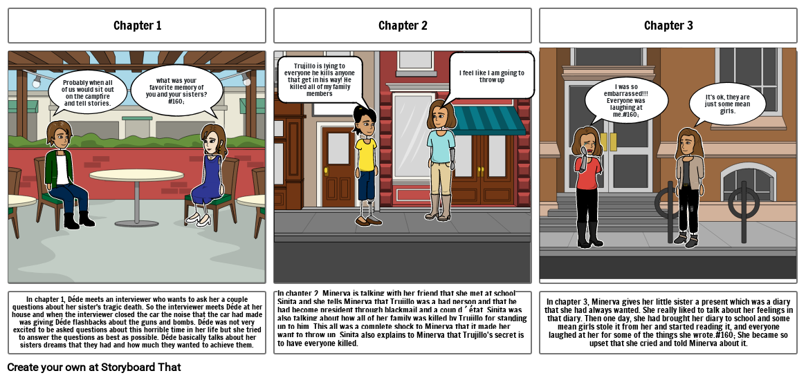 In chapter 2, Minerva is talking with her friend that she met at school Sinita and she tells Minerva that Trujillo was a bad person and that he had become president through blackmail and a coup d ´ état. Sinita was also talking about how all of her family was killed by Trujillo for standing up to him. This all was a complete shock to Minerva that it made her want to throw up. Sinita also explains to Minerva that Trujillo's secret is to have everyone killed.