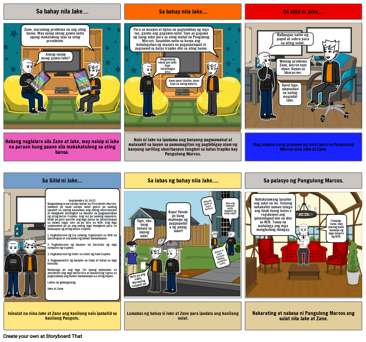 Septyembre 16, 2022 Magandang araw sainyo mahal na Presidente Marcos. Sumulat po kami sainyo dahil gusto po naming ipaabot sa inyong kaalaman ang aming obserbasyon at mungkahi patungkol sa maayos na pagpapatupad ng ating batas trapiko. Ang isa po naming napansin, hindi po pare-pareho ang mga batas na ipinatutupad sa bawat lugar lalo na po dito sa NCR. Ang mga sumusunod po ay ang aming mga mungkahi para sa ikakaayos ng ating batas trapiko. 1. Pagkakaroon ng isa lamang regulasyon sa NCR na ipatutupad at susundin ng bawat mamamayan.2. Pagkakaroon ng maayos na karatula ng mga senyales ng trapiko.3. Pagkakaroon ng timer sa lahat ng ilaw trapiko.4. Pagpapanatili ng maayos na linya at kulay sa mga kalsada.Mahalaga po ang mga ito upang makaiwas sa aksidente ang mga motorista at manatiling ligtas sa paglalakbay ang bawat mamamayan sa ating bayan.Lubos na gumagalang,Jake at Zane