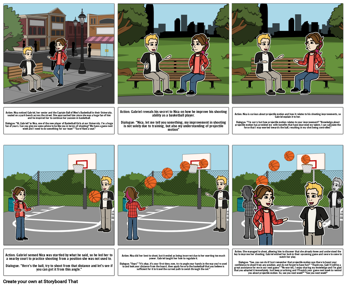 Action: Nica noticed Gabriel, her senior and the Captain Ball of Men's Basketball in their University, seated on a park bench across the street. She approached him since she was a huge fan of him and he inspired her to continue her passion in basketball.Dialogue: "Hi, Gabriel! 'm Nica, one of the new player of Basketball Girls at our University. I'm a huge fan of yours. Can you give me some advice to be like you in terms of shooting? We have a game next week and I need to do something for our team" "Sure! Have a seat."