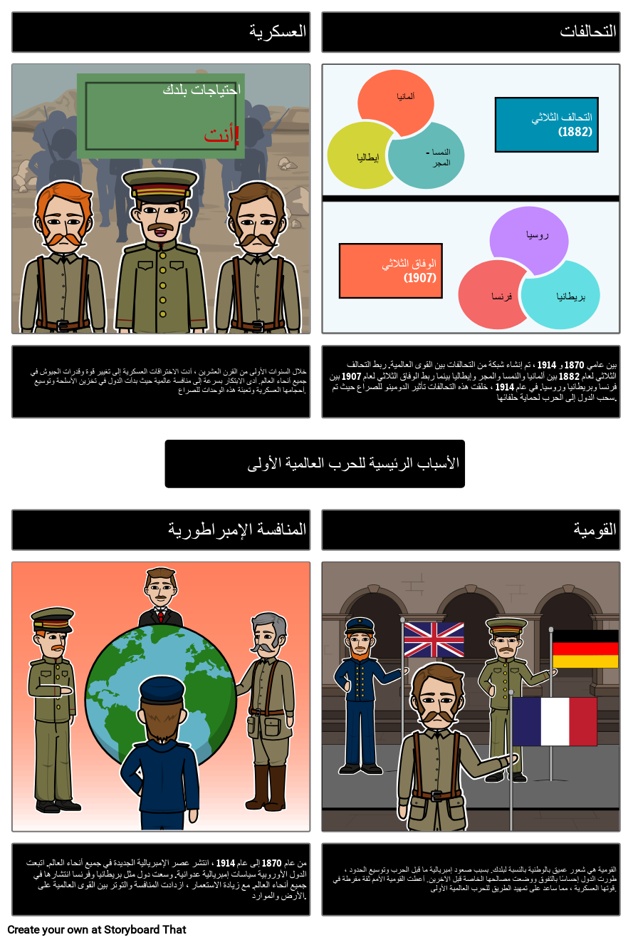 بين عامي 1870 و 1914 ، تم إنشاء شبكة من التحالفات بين القوى العالمية. ربط التحالف الثلاثي لعام 1882 بين ألمانيا والنمسا والمجر وإيطاليا بينما ربط الوفاق الثلاثي لعام 1907 بين فرنسا وبريطانيا وروسيا. في عام 1914 ، خلقت هذه التحالفات تأثير الدومينو للصراع حيث تم سحب الدول إلى الحرب لحماية حلفائها.