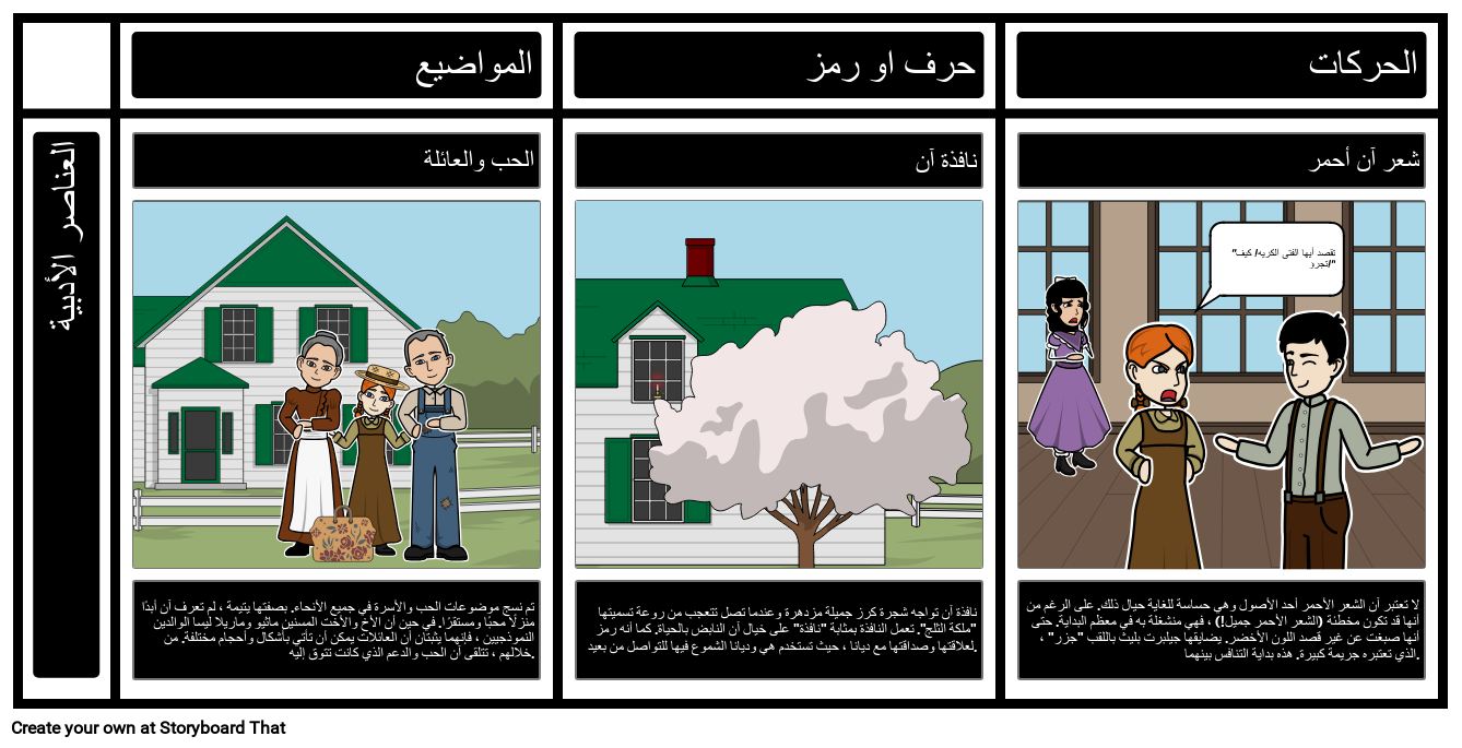 هناك العديد من العناصر الأدبية لإثراء قصة آن غرين جابلز. يمكن للطلاب تتبع الموضوعات والرموز والزخارف والإنذارات عند مواجهتها في الرواية وإنشاء لوحة مصورة مع الرسوم التوضيحية والأوصاف التي تستشهد بالأدلة من النص.