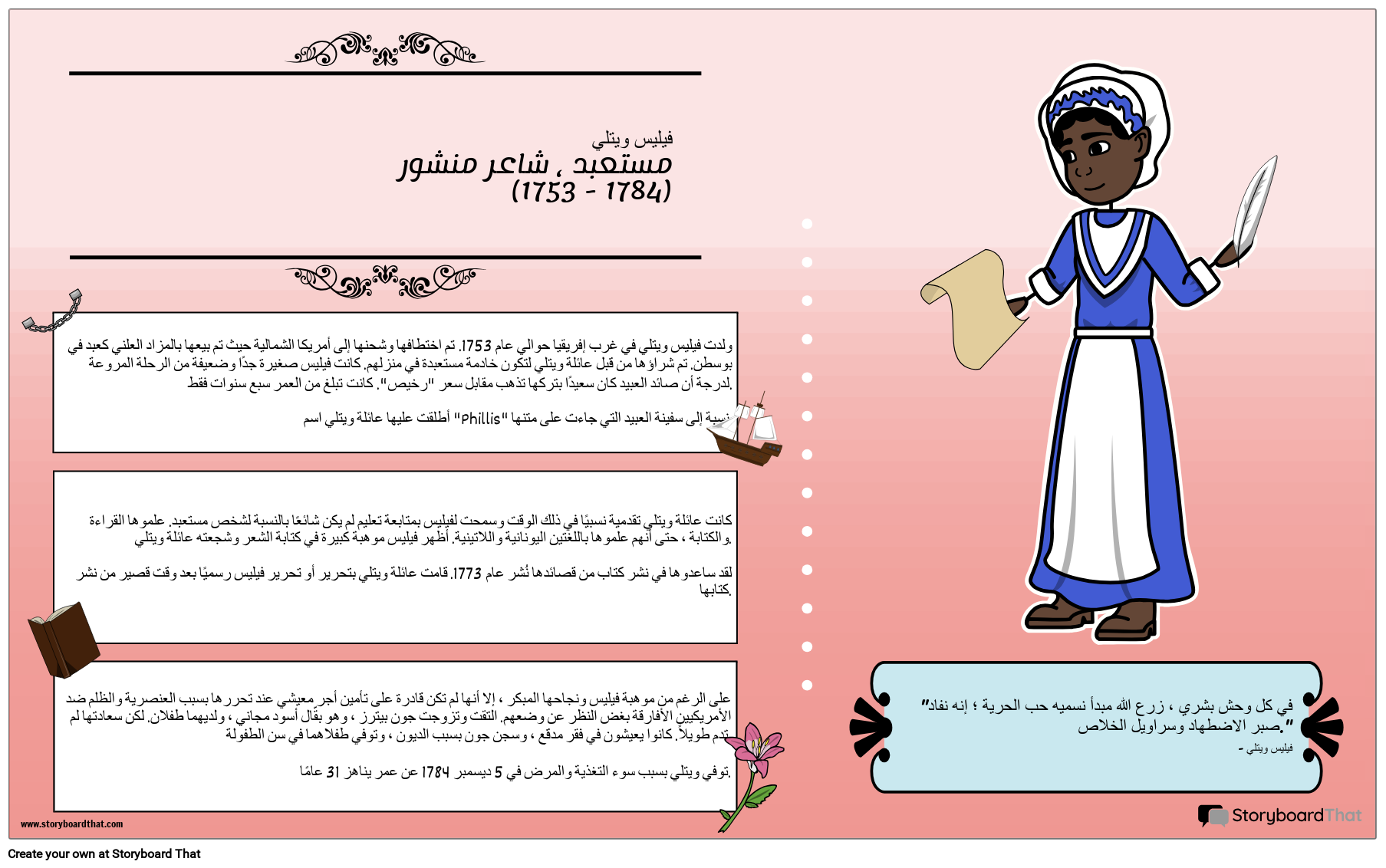 تعد ملصقات السيرة الذاتية طريقة رائعة لتسليط الضوء على الأحداث الهامة والإنجازات في حياة الشخص باستخدام الصور والنصوص. يركز ملصق السيرة الذاتية هذا على فيليس ويتلي ، وهي امرأة مستعبدة أصبحت شاعرة مشهورة وأول امرأة أمريكية من أصل أفريقي منشورة.