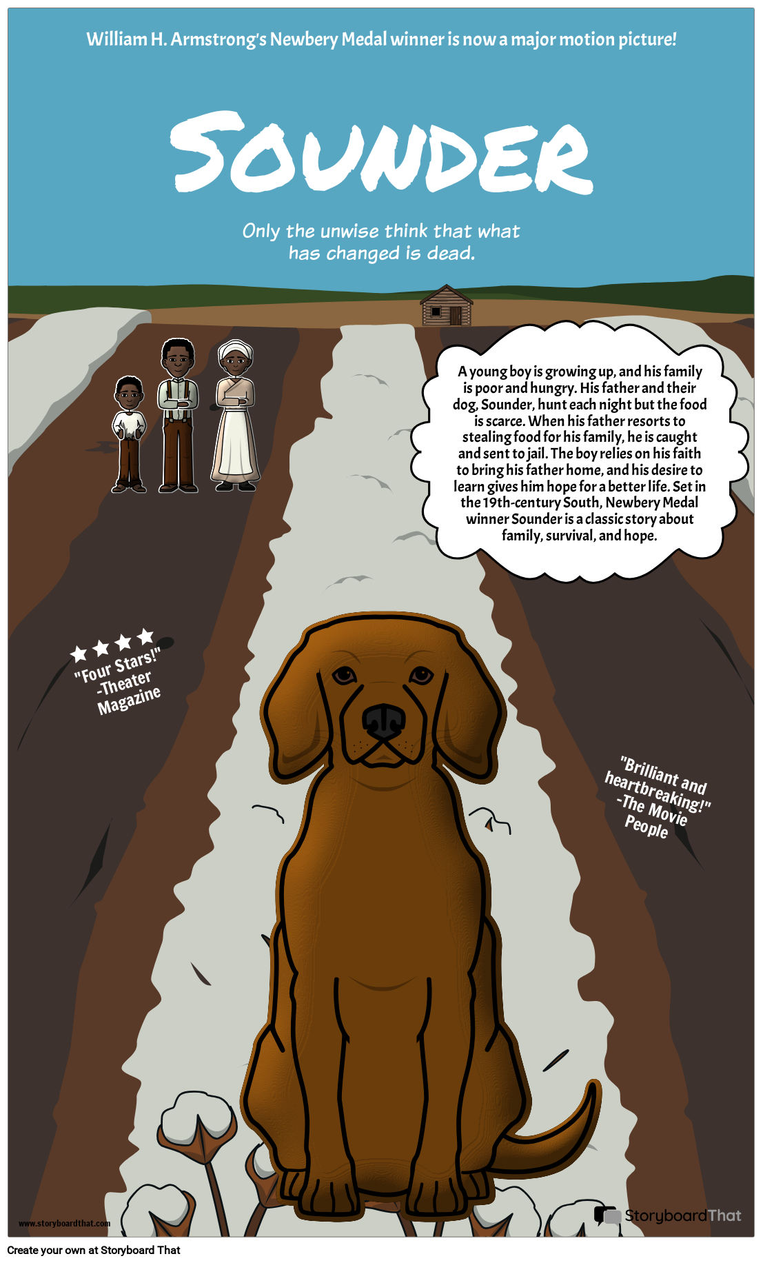 يعد إنشاء ملصق فيلم طريقة رائعة لإبراز الشخصيات والسمات والمزيد! هذا المثال لـ Sounder بواسطة William H. Armstrong.
