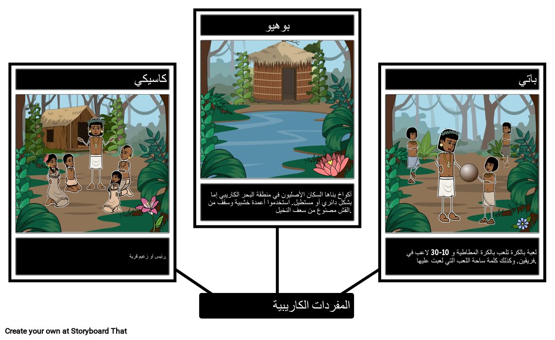 أكواخ بناها السكان الأصليون في منطقة البحر الكاريبي إما بشكل دائري أو مستطيل. استخدموا أعمدة خشبية وسقف من القش مصنوع من سعف النخيل.