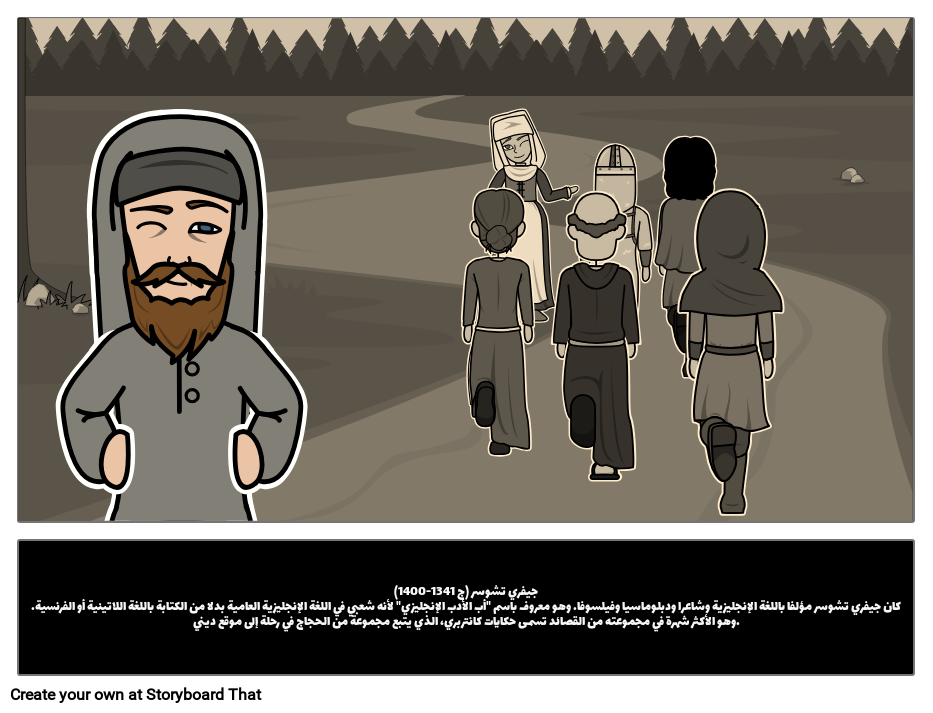 جيفري تشوسر (ج 1341-1400)كان جيفري تشوسر مؤلفا باللغة الإنجليزية وشاعرا ودبلوماسيا وفيلسوفا. وهو معروف باسم "أب الأدب الإنجليزي" لأنه شعبي في اللغة الإنجليزية العامية بدلا من الكتابة باللغة اللاتينية أو الفرنسية. وهو الأكثر شهرة في مجموعته من القصائد تسمى حكايات كانتربري، الذي يتبع مجموعة من الحجاج في رحلة إلى موقع ديني.