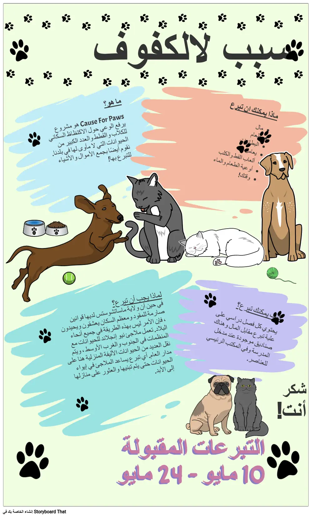 ما هو؟ Cause For Paws هو مشروع يرفع الوعي حول الاكتظاظ السكاني للكلاب والقطط والعدد الكبير من الحيوانات التي لا مأوى لها في بلدنا. نقوم أيضًا بجمع الأموال والأشياء للتبرع بها!