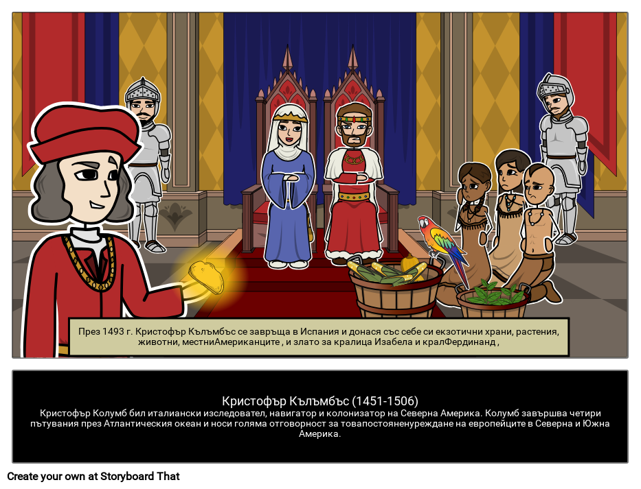 През 1493 г. Кристофър Кълъмбъс се завръща в Испания и донася със себе си екзотични храни, растения, животни, местниАмериканците , и злато за кралица Изабела и кралФердинанд ,