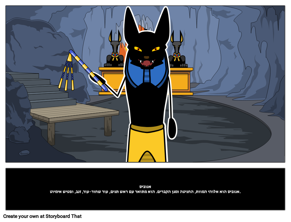אנוביסאנוביס הוא אלוהי המוות, החניטה ומגן הקברים. הוא מתואר עם ראש תנים, עור שחור-עור, זנב, ופטיש אימיוט.