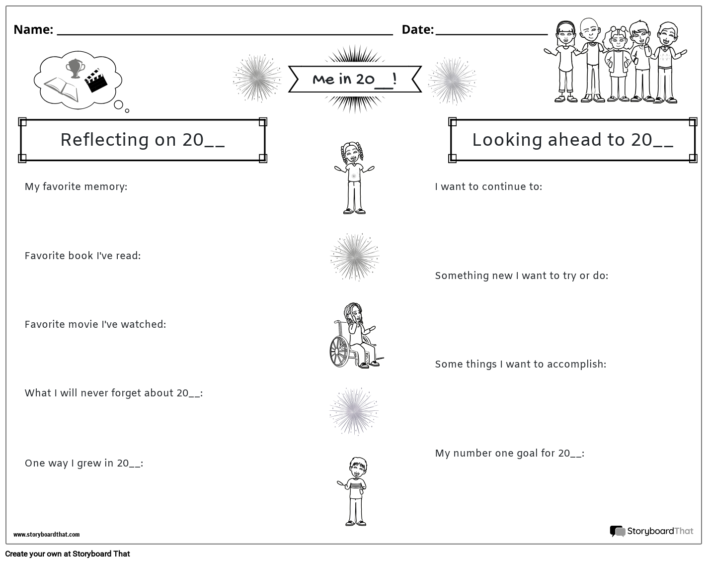 छात्र इस प्रतिबिंब और लक्ष्य निर्धारण कार्यपत्रक का उपयोग पिछले वर्ष की अपनी यादों को संक्षेप में करने और नए साल के लिए अपने लक्ष्यों पर मंथन करने के लिए कर सकते हैं! यह अनुकूलन योग्य ब्लैक एंड व्हाइट वर्कशीट डिजिटल रूप से मुद्रित या उपयोग करने के लिए डिज़ाइन की गई है।