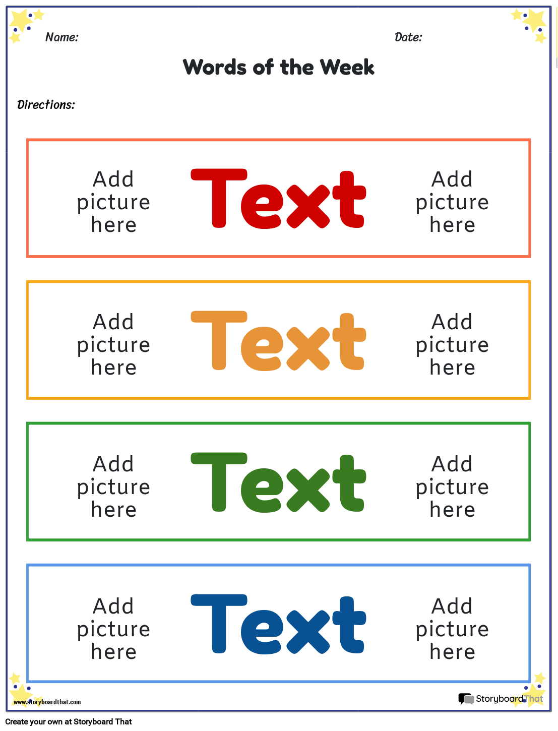 छात्र अपने स्वयं के "सप्ताह के शब्द" (चुनौतीपूर्ण शब्द जो उनके लिए नए हैं) की पहचान करते हैं या शिक्षक स्वयं नए शब्दों का परिचय दे सकते हैं। इस वर्कशीट को नए शब्दों के साथ-साथ कला के साथ अनुकूलित किया जा सकता है जो प्रत्येक का प्रतिनिधित्व करता है। कार्यपत्रकों को मुद्रित किया जा सकता है, काटा जा सकता है और कमरे के चारों ओर लटकाया जा सकता है या आसान संदर्भ के लिए फ्लैशकार्ड के रूप में संग्रहीत किया जा सकता है!