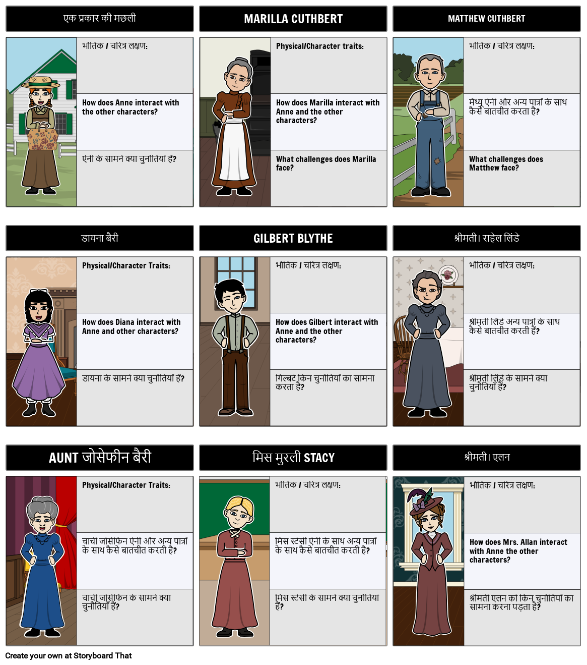 ग्रीन गैबल्स, उनकी प्रेरणाओं, चुनौतियों, लक्षणों, आदि में पात्रों का ट्रैक रखने के लिए एक चरित्र मानचित्र बनाएं!