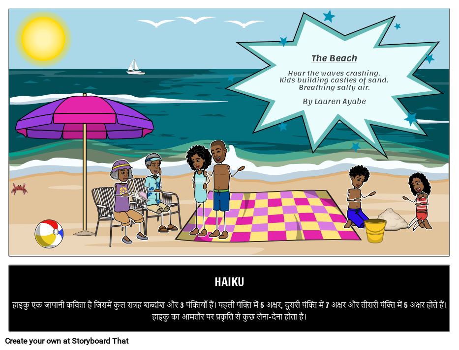 HAIKU हाइकु एक जापानी कविता है जिसमें कुल सत्रह शब्दांश और 3 पंक्तियाँ हैं। पहली पंक्ति में 5 अक्षर, दूसरी पंक्ति में 7 अक्षर और तीसरी पंक्ति में 5 अक्षर होते हैं। हाइकु का आमतौर पर प्रकृति से कुछ लेना-देना होता है।