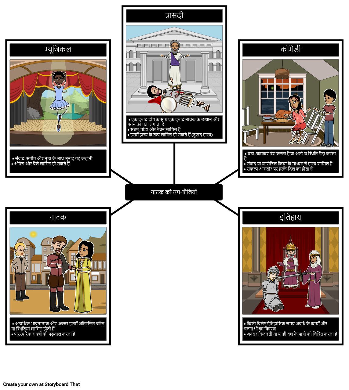 • संवाद, संगीत और नृत्य के साथ सुनाई गई कहानी • ओपेरा और बैले शामिल हो सकते हैं