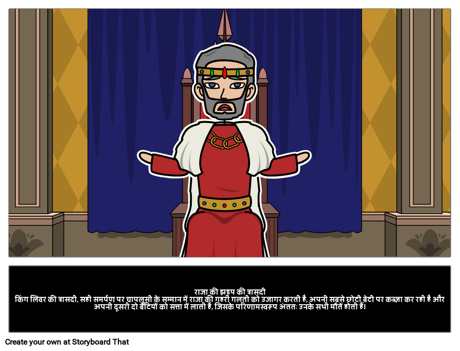 राजा की झड़प की त्रासदीकिंग लिवर की त्रासदी, सही समर्पण पर चापलूसी के सम्मान में राजा की गहरी गलती को उजागर करती है, अपनी सबसे छोटी बेटी पर कब्ज़ा कर रही है और अपनी दूसरी दो बेटियों को सत्ता में लाती है, जिसके परिणामस्वरूप अंततः उनके सभी मौतें होती हैं।