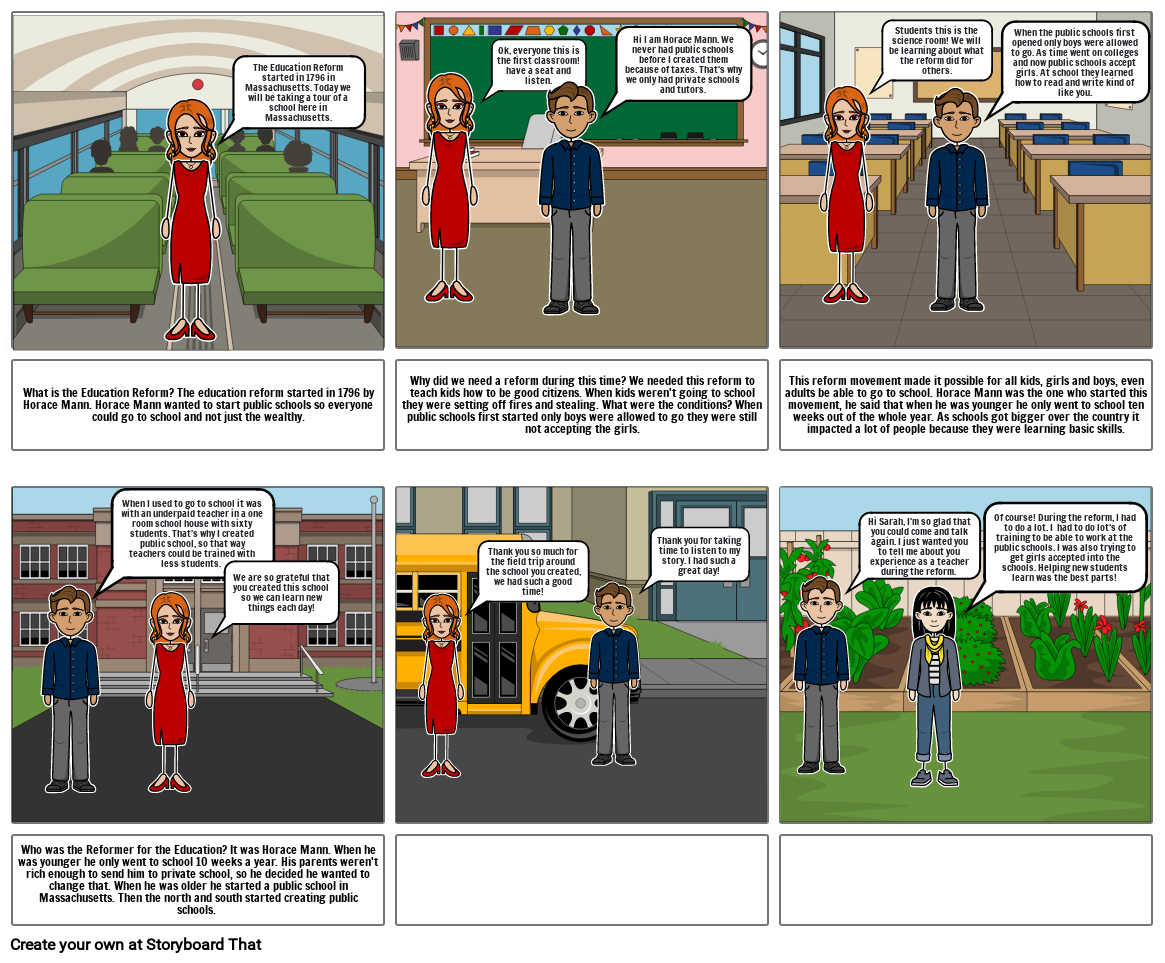 What is the Education Reform? The education reform started in 1796 by Horace Mann. Horace Mann wanted to start public schools so everyone could go to school and not just the wealthy.