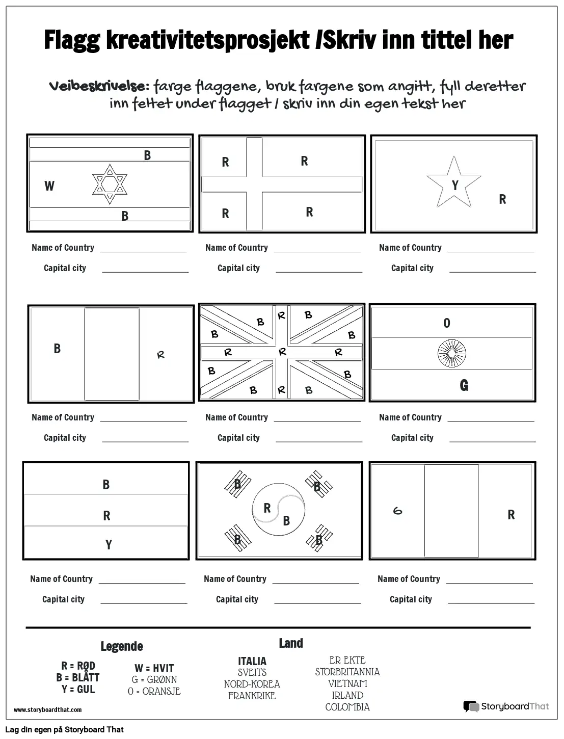 Veibeskrivelse: farge flaggene, bruk fargene som angitt, fyll deretter inn feltet under flagget / skriv inn din egen tekst her