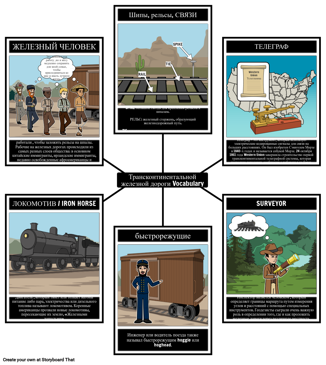 Создайте карту-паук, иллюстрирующую ключевые термины, относящиеся к первой Трансконтинентальной железной дороге в Соединенных Штатах!