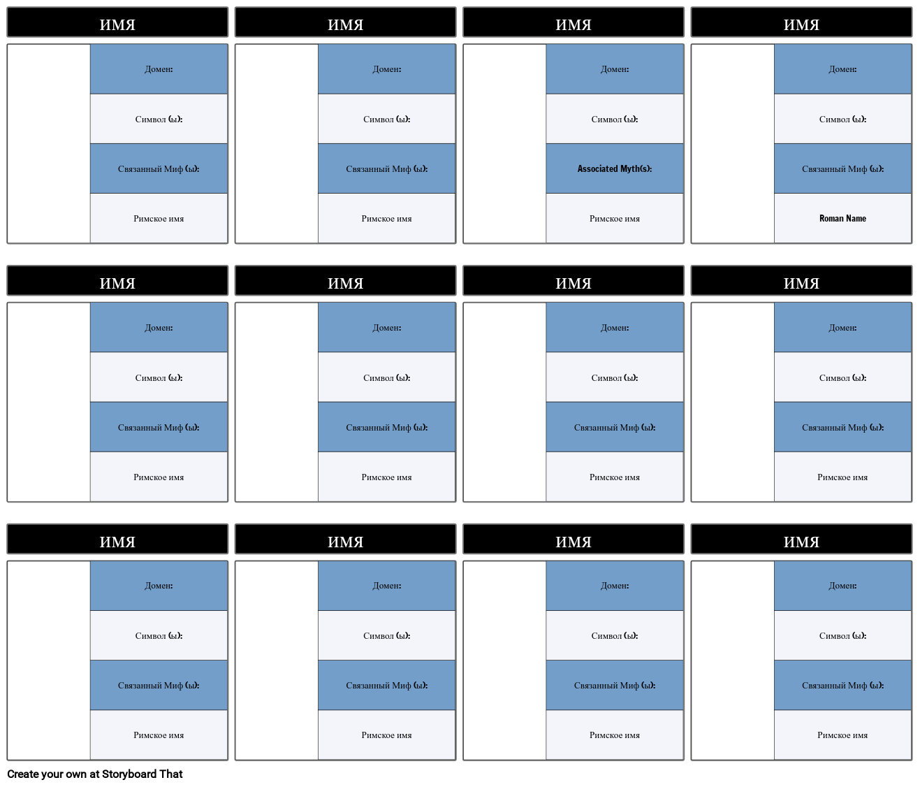 Шаблон карты персонажей для греческих богов и богинь. Поля включают домен, символ, связанные мифы и римское имя.