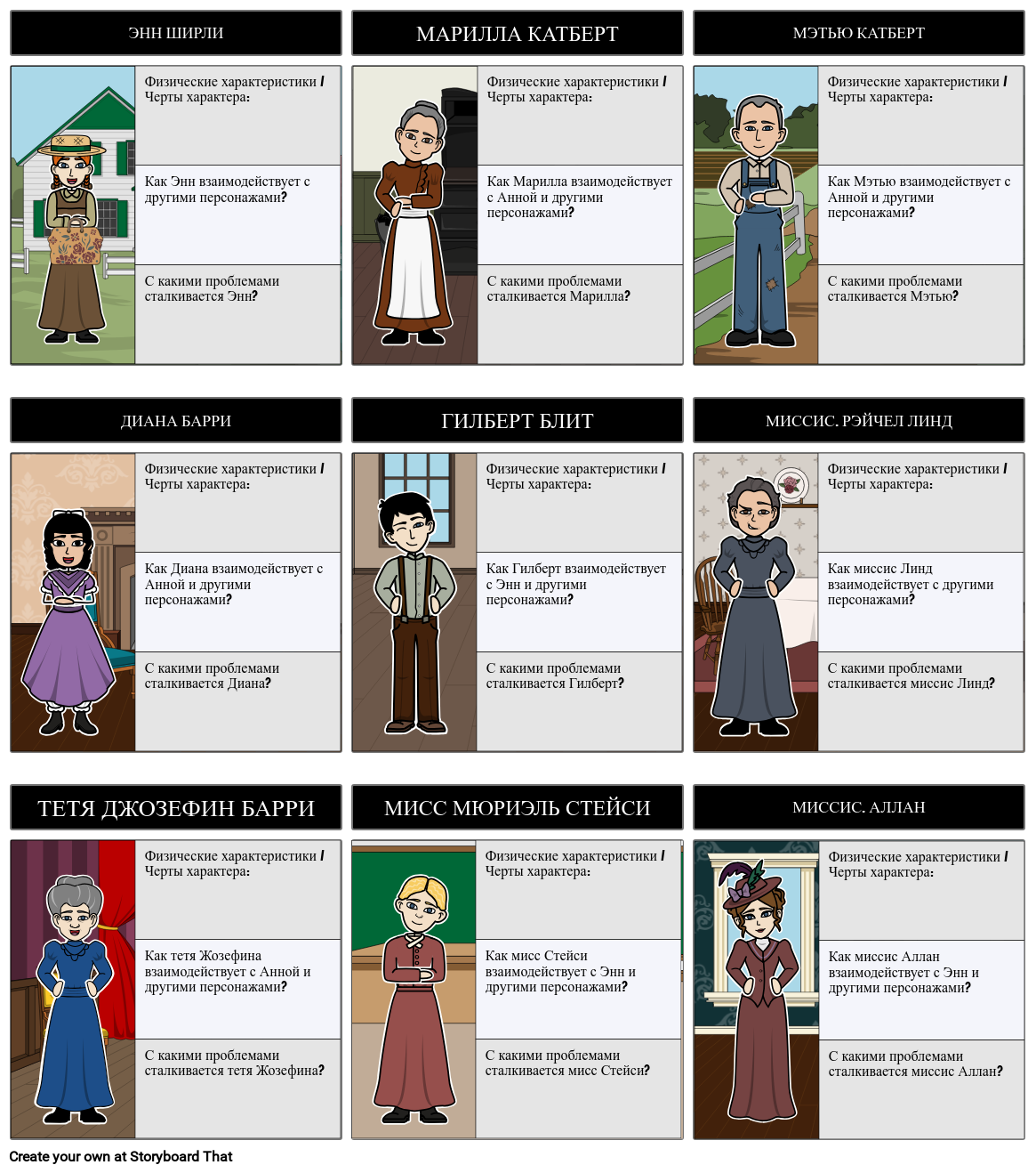 Создайте карту персонажей, чтобы отслеживать персонажей Анны из Зеленых Мезонинов, их мотивации, проблемы, черты характера и многое другое!