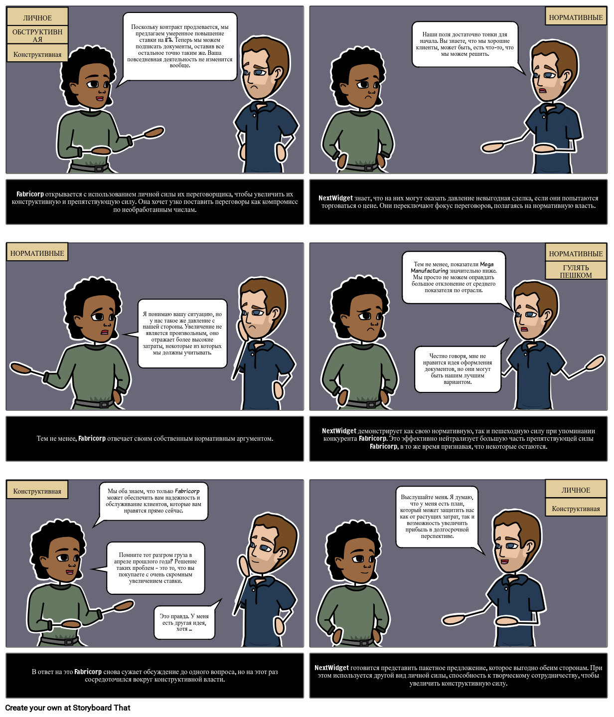 Раскадровка, изображающая различные типы переговорной силы, используемой во время переговоров.