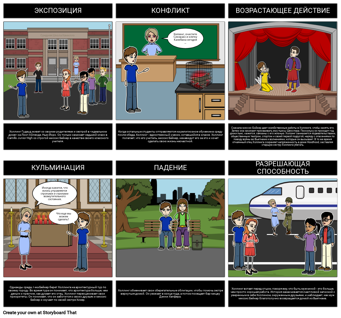 Сначала миссис Бэйкер дает хозяйственные работы в Холлинге, чтобы занять его. Затем она начинает присваивать ему пьесы Шекспира. Поскольку он проходит год, уроки пьес, кажется, связаны с его жизнью. Холлинг занимается издевательствами, общественным театром, спортом и своей первой подругой, наряду с опасениями по поводу войны во Вьетнаме и волнениями, которые он вызывает. В то же время отчаянный отец Холлинга сохраняет напряженность в доме Hoodhood, заставляя старшую сестру Холлинга убегать.