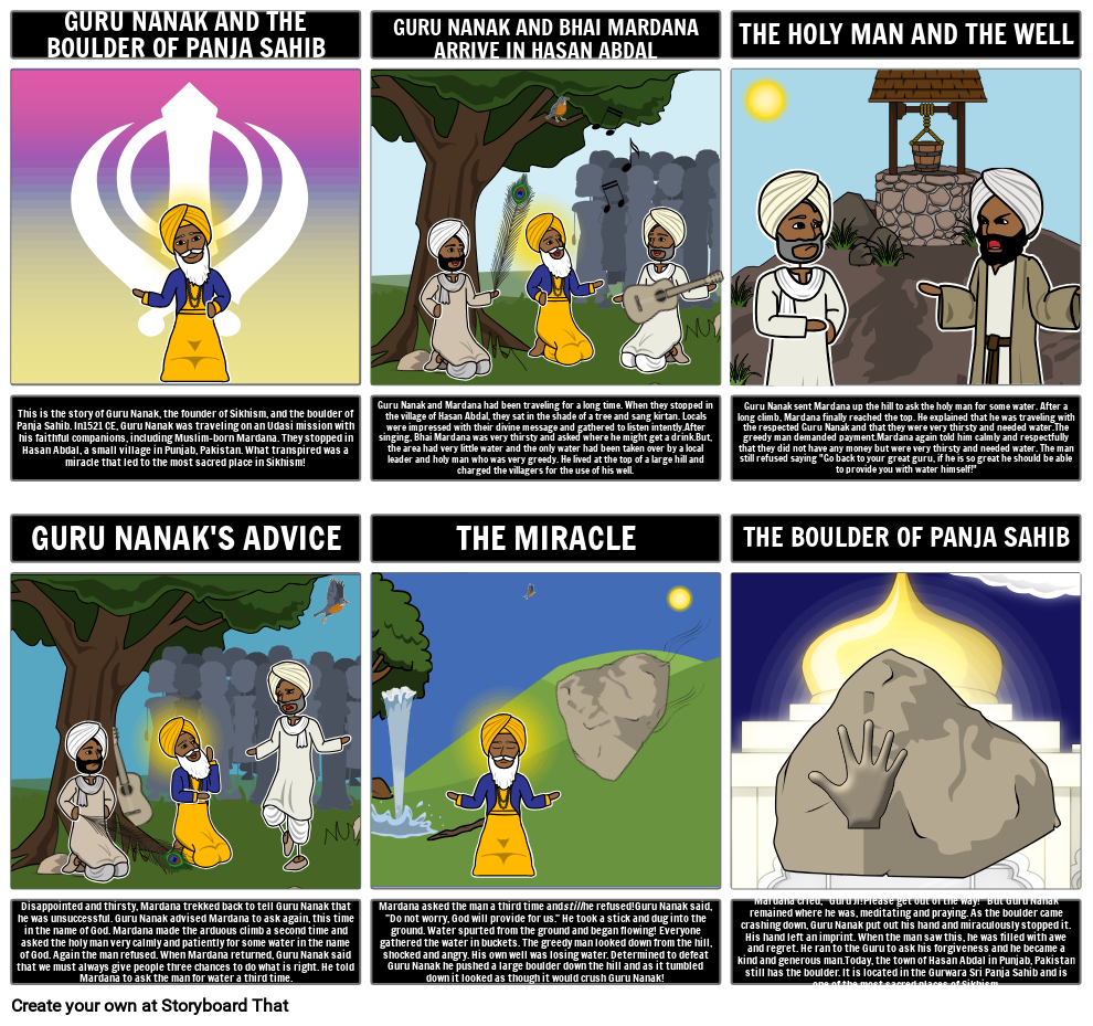 Mardana cried, "Guru Ji!Please get out of the way!" But Guru Nanak remained where he was, meditating and praying. As the boulder came crashing down, Guru Nanak put out his hand and miraculously stopped it. His hand left an imprint. When the man saw this, he was filled with awe and regret. He ran to the Guru to ask his forgiveness and he became a kind and generous man.Today, the town of Hasan Abdal in Punjab, Pakistan still has the boulder. It is located in the Gurwara Sri Panja Sahib and is one of the most sacred places of Sikhism.