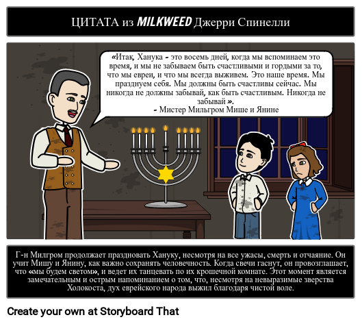 Г-н Милгром продолжает праздновать Хануку, несмотря на все ужасы, смерть и отчаяние. Он учит Мишу и Янину, как важно сохранять человечность. Когда свечи гаснут, он провозглашает, что «мы будем светом», и ведет их танцевать по их крошечной комнате. Этот момент является замечательным и острым напоминанием о том, что, несмотря на невыразимые зверства Холокоста, дух еврейского народа выжил благодаря чистой воле.