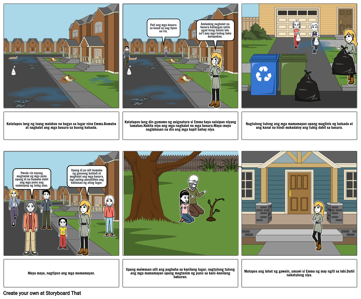 Katatapos lang din gumawa ng asignatura si Emma kaya naisipan niyang lumabas.Nakita niya ang mga nagkalat na mga basura.Maya-maya naglabasan na din ang mga kapit bahay niya.