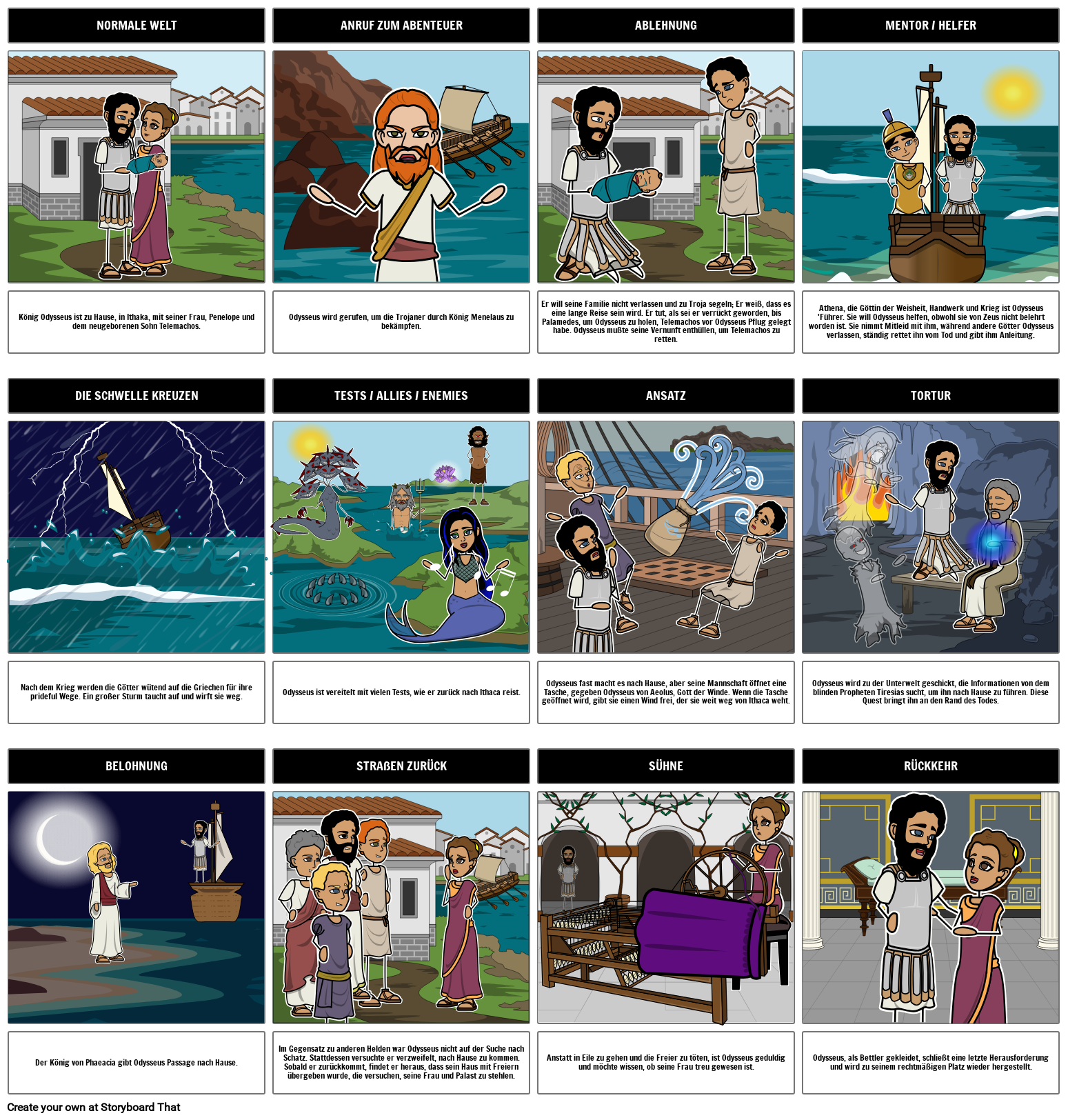 Ein Beispiel für eine archetypische Situation oder Handlungsform findet sich in „Die Heldenreise“. In der Odyssee begegnet Odysseus auf seiner Suche nach Ithaka vielen Gefahren, wobei das Thema der Sehnsucht nach der Heimkehr weltweit Anklang findet.