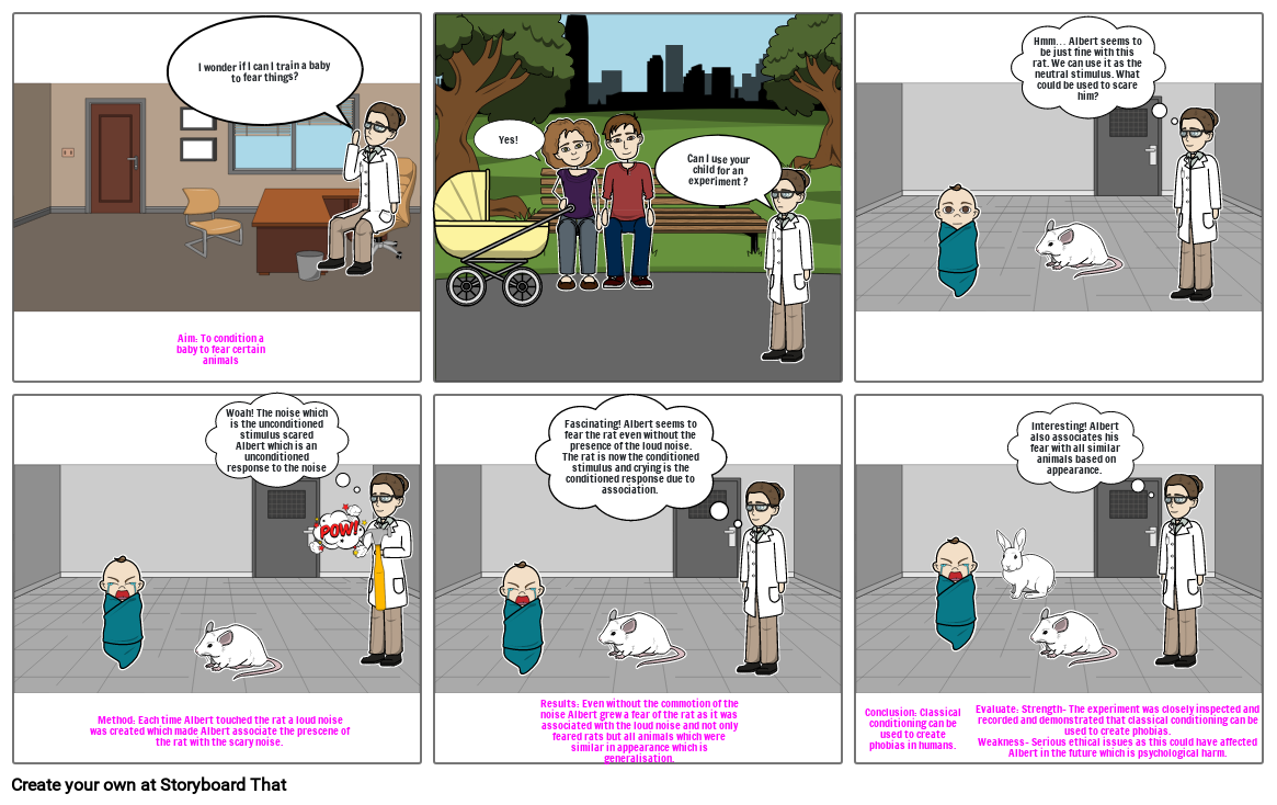 Results: Even without the commotion of the noise Albert grew a fear of the rat as it was associated with the loud noise and not only feared rats but all animals which were similar in appearance which is generalisation.