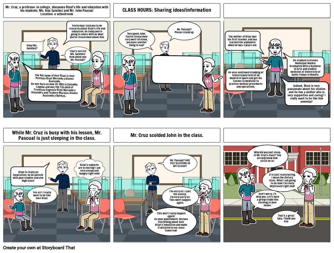 Mr. Cruz, a professor in college, discusses Rizal's life and education with his students: Ms. Ana Sanchez and Mr. John PascualLocation: a schoolroom