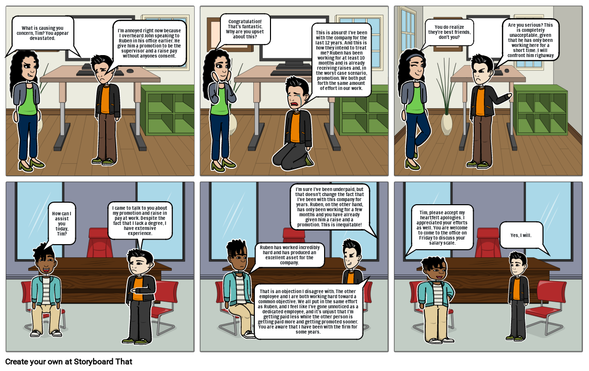 This is absurd! I've been with the company for the last 12 years. And this is how they intend to treat me? Ruben has been working for at least 10 months and is already receiving raises and, in the worst case scenario, promotion. We both put forth the same amount of effort in our work.