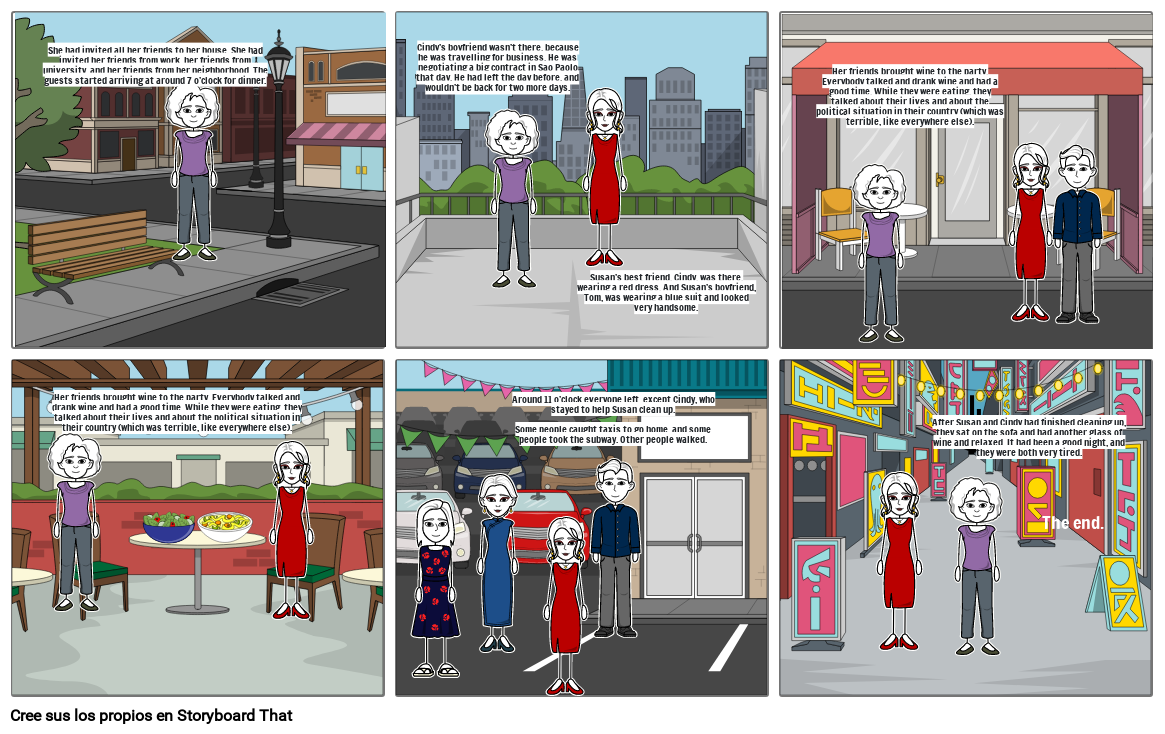 Susan’s best friend, Cindy, was there, wearing a red dress. And Susan’s boyfriend, Tom, was wearing a blue suit and looked very handsome.