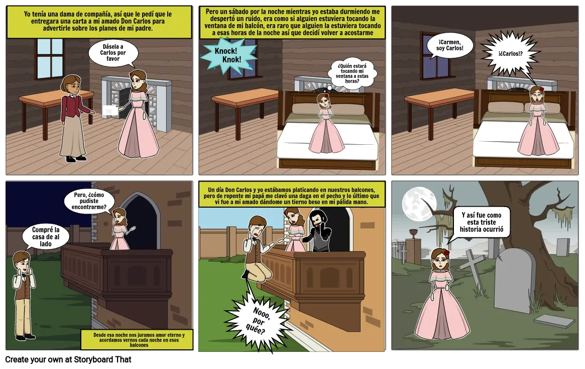 Un día Don Carlos y yo estábamos platicando en nuestros balcones, pero de repente mi papá me clavó una daga en el pecho y lo último que vi fue a mi amado dándome un tierno beso en mi pálida mano.