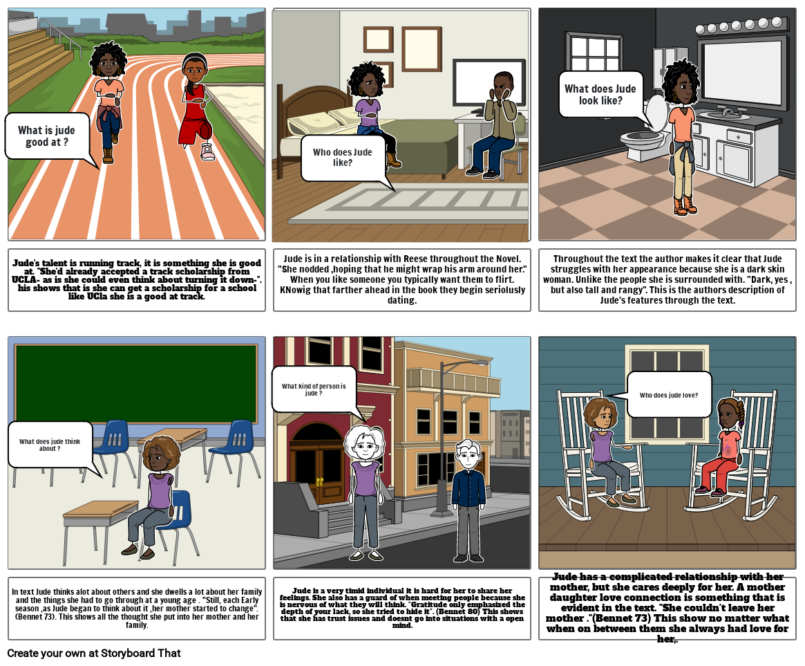 Throughout the text the author makes it clear that Jude struggles with her appearance because she is a dark skin woman. Unlike the people she is surrounded with. "Dark, yes , but also tall and rangy". This is the authors description of Jude's features through the text.