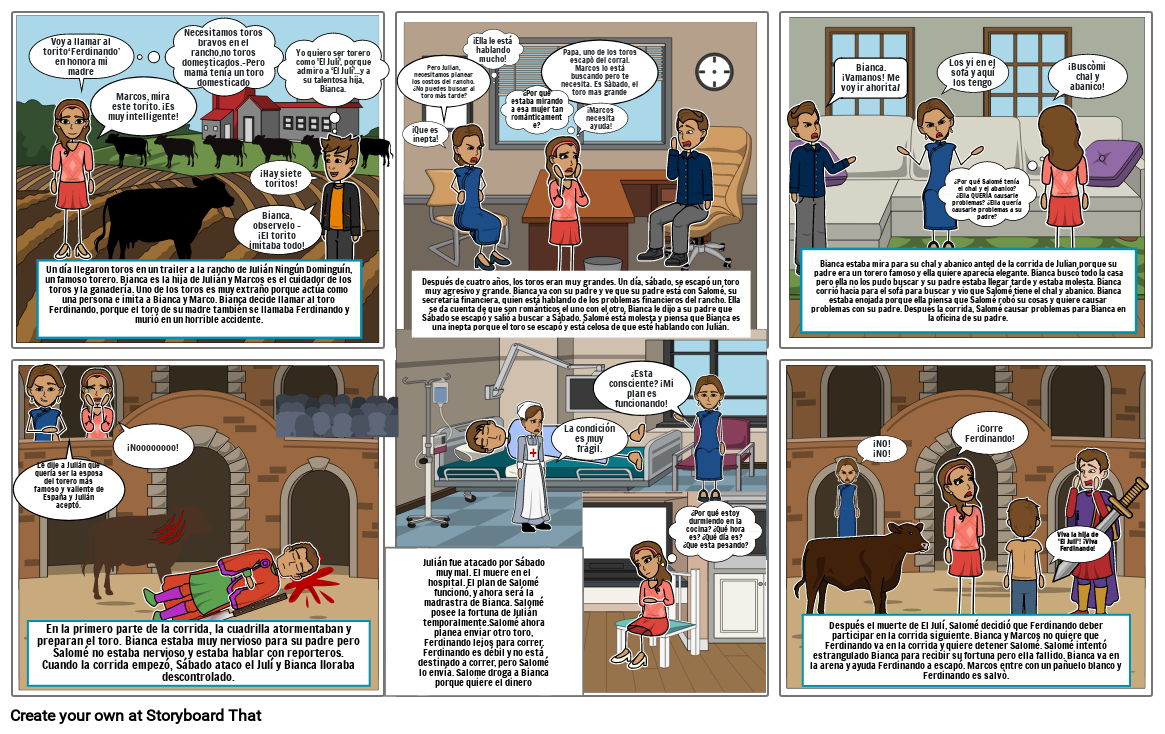 Bianca estaba mira para su chal y abanico anted de la corrida de Julian porque su padre era un torero famoso y ella quiere aparecía elegante. Bianca buscó todo la casa pero ella no los pudo buscar y su padre estaba llegar tarde y estaba molesta. Bianca corrió hacia para el sofá para buscar y vio que Salomé tiene el chal y abanico. Bianca estaba enojada porque ella piensa que Salomé robó su cosas y quiere causar problemas con su padre. Después la corrida, Salomé causar problemas para Bianca en la oficina de su padre.