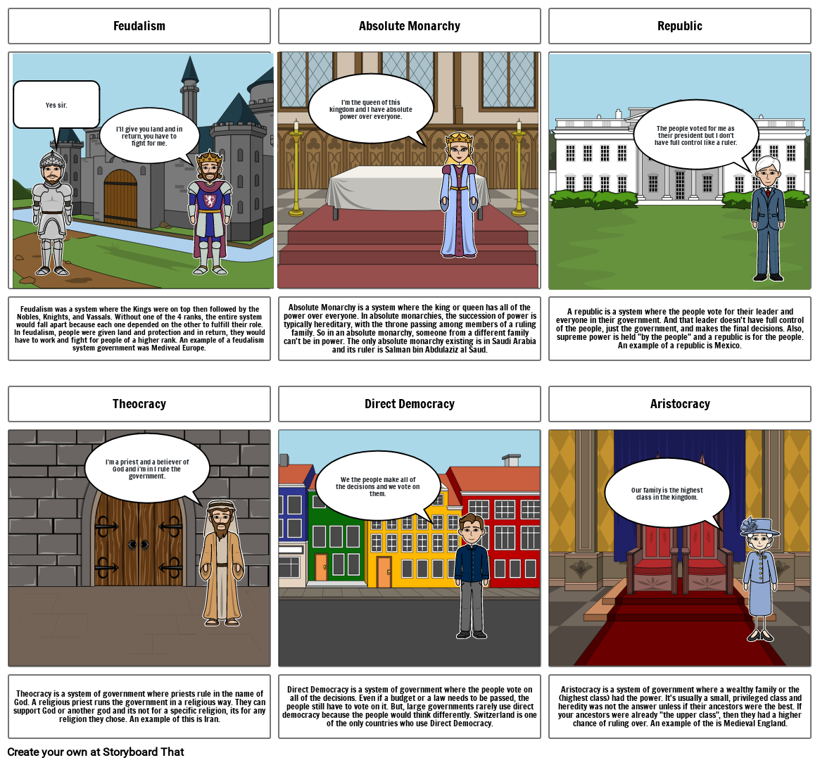 Feudalism was a system where the Kings were on top then followed by the Nobles, Knights, and Vassals. Without one of the 4 ranks, the entire system would fall apart because each one depended on the other to fulfill their role. In feudalism, people were given land and protection and in return, they would have to work and fight for people of a higher rank. An example of a feudalism system government was Mediveal Europe.