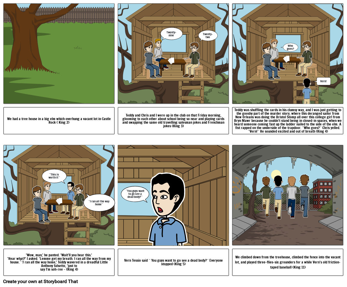 Teddy was shuffling the cards in his clumsy way, and I was just getting to the gooshy part of the murder story, where this deranged sailor from New Orleans was doing the Bristol Stomp all over this college girl from Bryn Mawr because he couldn’t stand being in closed-in spaces, when we heard someone coming fast up the ladder nailed to the side of the elm. A fist rapped on the underside of the trapdoor. ¨Who goes?¨ Chris yelled. ¨Vern!¨ He sounded excited and out of breath (King 4)