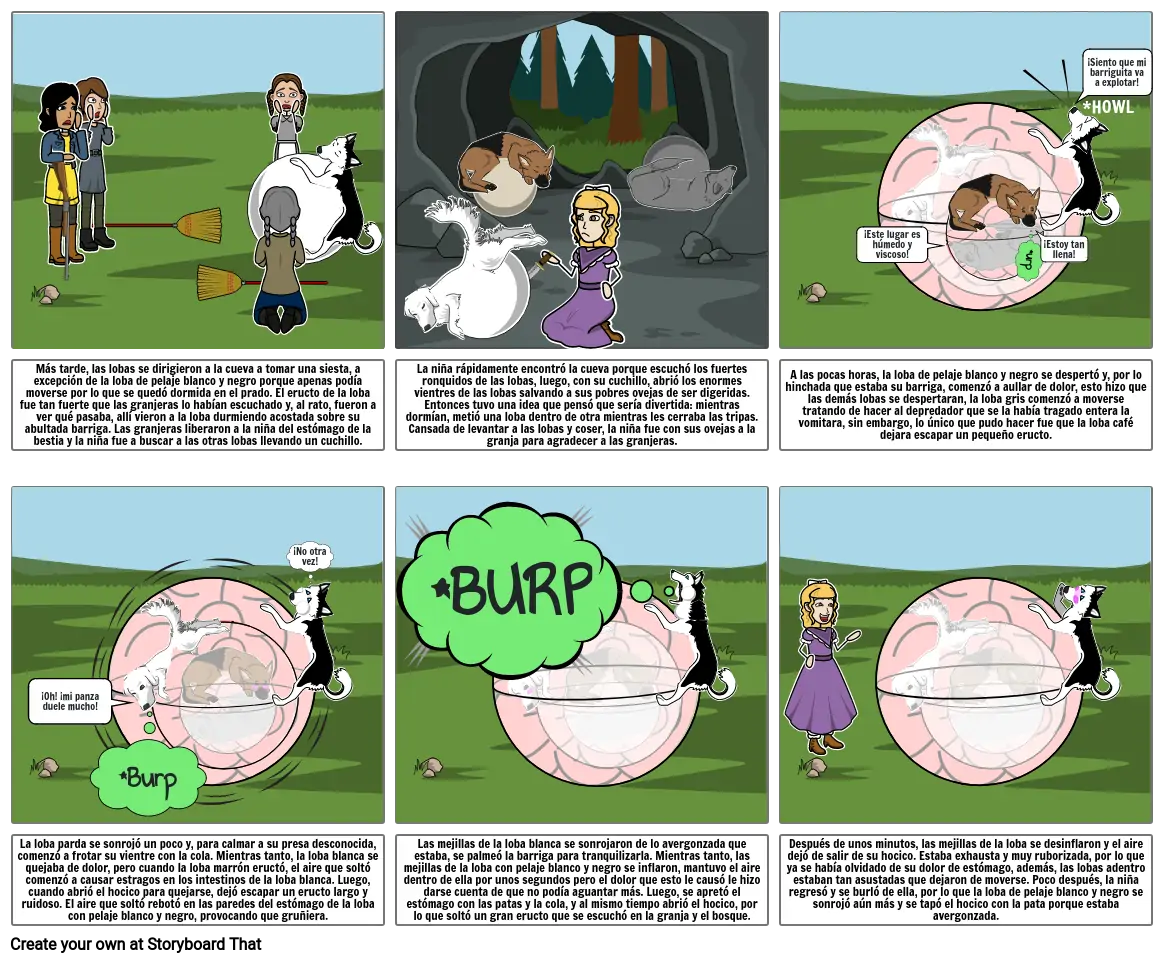 A las pocas horas, la loba de pelaje blanco y negro se despertó y, por lo hinchada que estaba su barriga, comenzó a aullar de dolor, esto hizo que las demás lobas se despertaran, la loba gris comenzó a moverse tratando de hacer al depredador que se la había tragado entera la vomitara, sin embargo, lo único que pudo hacer fue que la loba café dejara escapar un pequeño eructo.