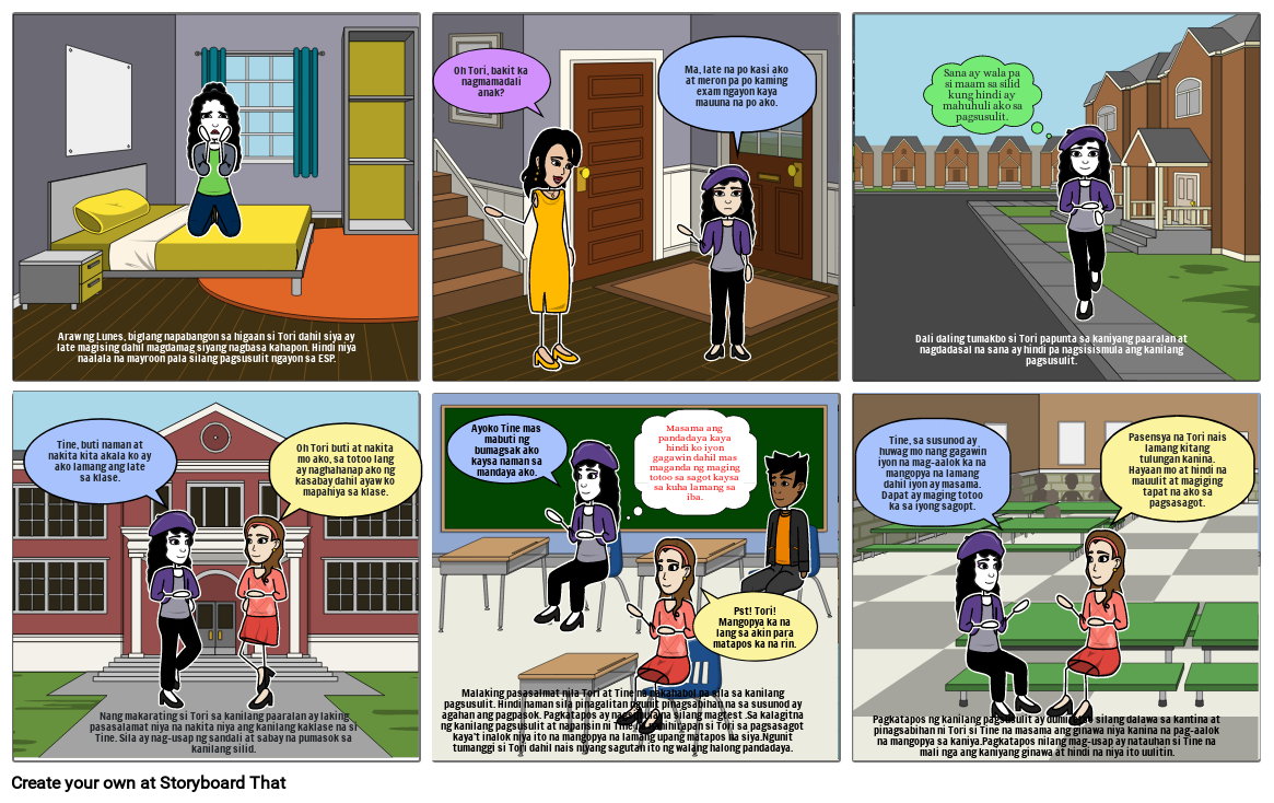 Araw ng Lunes, biglang napabangon sa higaan si Tori dahil siya ay late magising dahil magdamag siyang nagbasa kahapon. Hindi niya naalala na mayroon pala silang pagsusulit ngayon sa ESP.