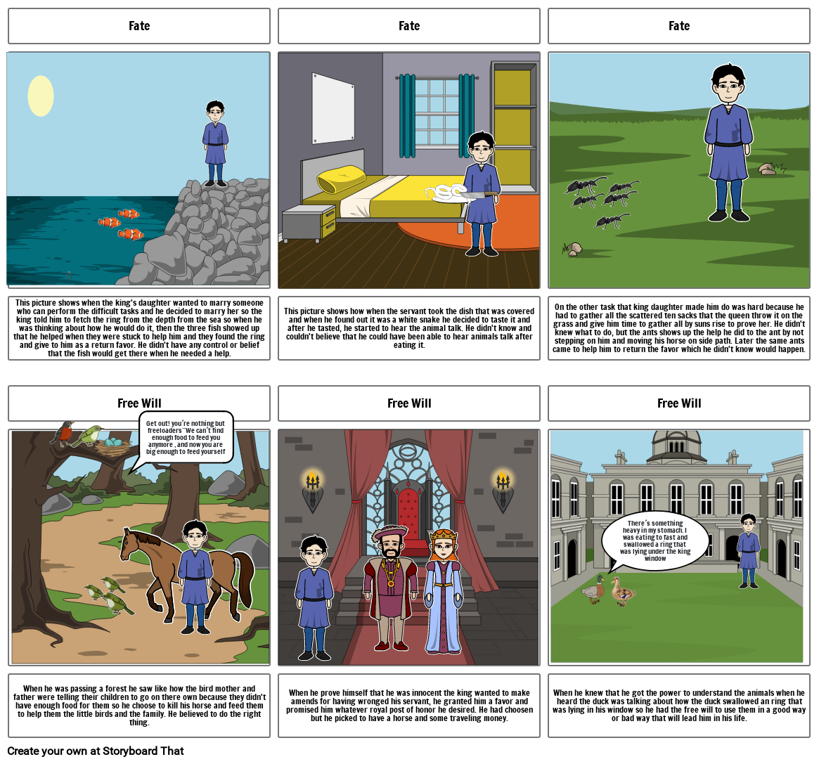 On the other task that king daughter made him do was hard because he had to gather all the scattered ten sacks that the queen throw it on the grass and give him time to gather all by suns rise to prove her. He didn't knew what to do, but the ants shows up the help he did to the ant by not stepping on him and moving his horse on side path. Later the same ants came to help him to return the favor which he didn't know would happen.