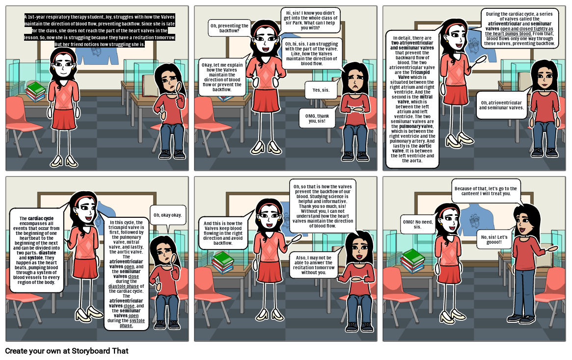 A 1st-year respiratory therapy student, Joy, struggles with how the Valves maintain the direction of blood flow, preventing backflow. Since she is late for the class, she does not reach the part of the heart valves in the lesson. So, now she is struggling because they have a recitation tomorrow. But her friend notices how struggling she is.