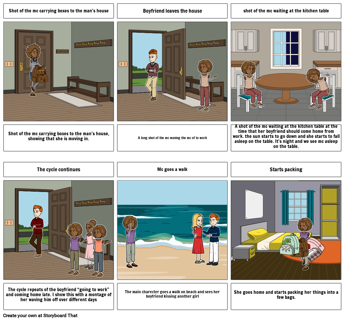 The cycle repeats of the boyfriend “going to work” and coming home late. I show this with a montage of her waving him off over different days