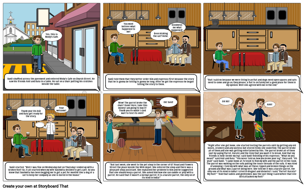 Right after she got home, she started testing the parrots skill by getting any old boxes, crockery and any useless but stored items she could find. The parrot broke all of them and she was getting entertained by this. The parrot broke all of them just by saying Parrot, Karate and the item that you want it to break. And that my friends is how I broke my leg, said Sunil finishing of his espresso. What do you mean? said Anil and Bala. You never told us how you broke your leg, they said. Oh yeah said Sunil. I came home at 7o'clock to find my wife and the parrot in the room. The parrot was walking on the sofa pulling the loose threads of the sofa. It was kind of annoying. I told my wife what was all these ripped and broken things on the ground and what was a parrot doing here. She told me it was a karate parrot, the only one of its kind in India! I cried in disgust and disbelief. I said Parrot! Karate? My foot! And that ladies and gentlemen, was the last thing I said before that vile bird attacked my foot!