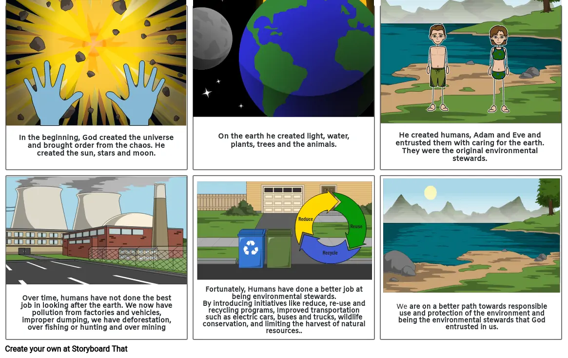 He created humans, Adam and Eve and entrusted them with caring for the earth. They were the original environmental stewards.
